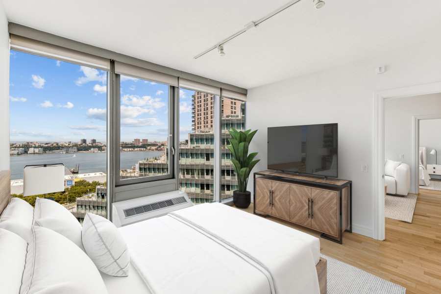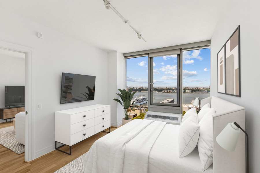 This luxury 2-bedroom, 2-bathroom unit, located in the heart of Midtown West, is a true one of a kind! As soon as you enter, you are immediately struck by the floor-to-ceiling windows, luxurious finishes, and modern design of the apartment. The spacious living room boasts breathtaking views of the Hudson River and incredible natural sunlight. The primary bedroom is an impressive room featuring a custom walk-in closet, an impressive en-suite bathroom, and an extra-large hallway closet for additional storage.