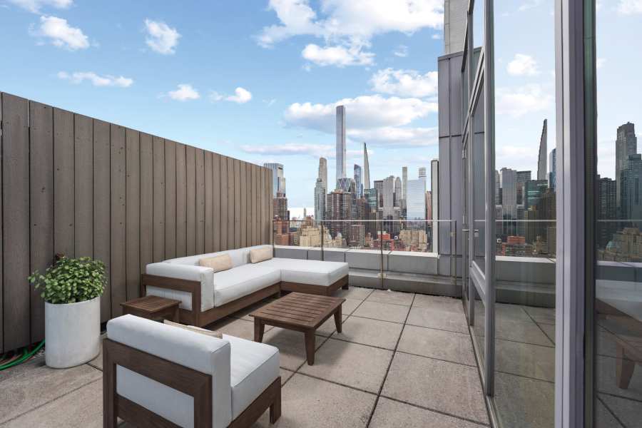 This stunning 2-bedroom 2-bathroom penthouse, located in the heart of Midtown West, is a true gem. As soon as you enter, you are immediately struck by the luxurious finishes and modern design of the apartment. The spacious living room boasts floor-to-ceiling windows that flood the space with natural light, as well as eastern windows with iconic Empire State Building views. The apartment features a large private terrace, perfect for enjoying your morning coffee while taking in the city from above. A truly unique highlight of this home is the separate dining room adjacent to the living area—the only one of its kind in the building—which also offers the flexibility to be converted into a third bedroom. The two bedrooms are equally impressive, each featuring custom-built closets, while the primary suite includes an en-suite bathroom complete with a stall shower and a separate deep soaking tub, creating a spa-like retreat.